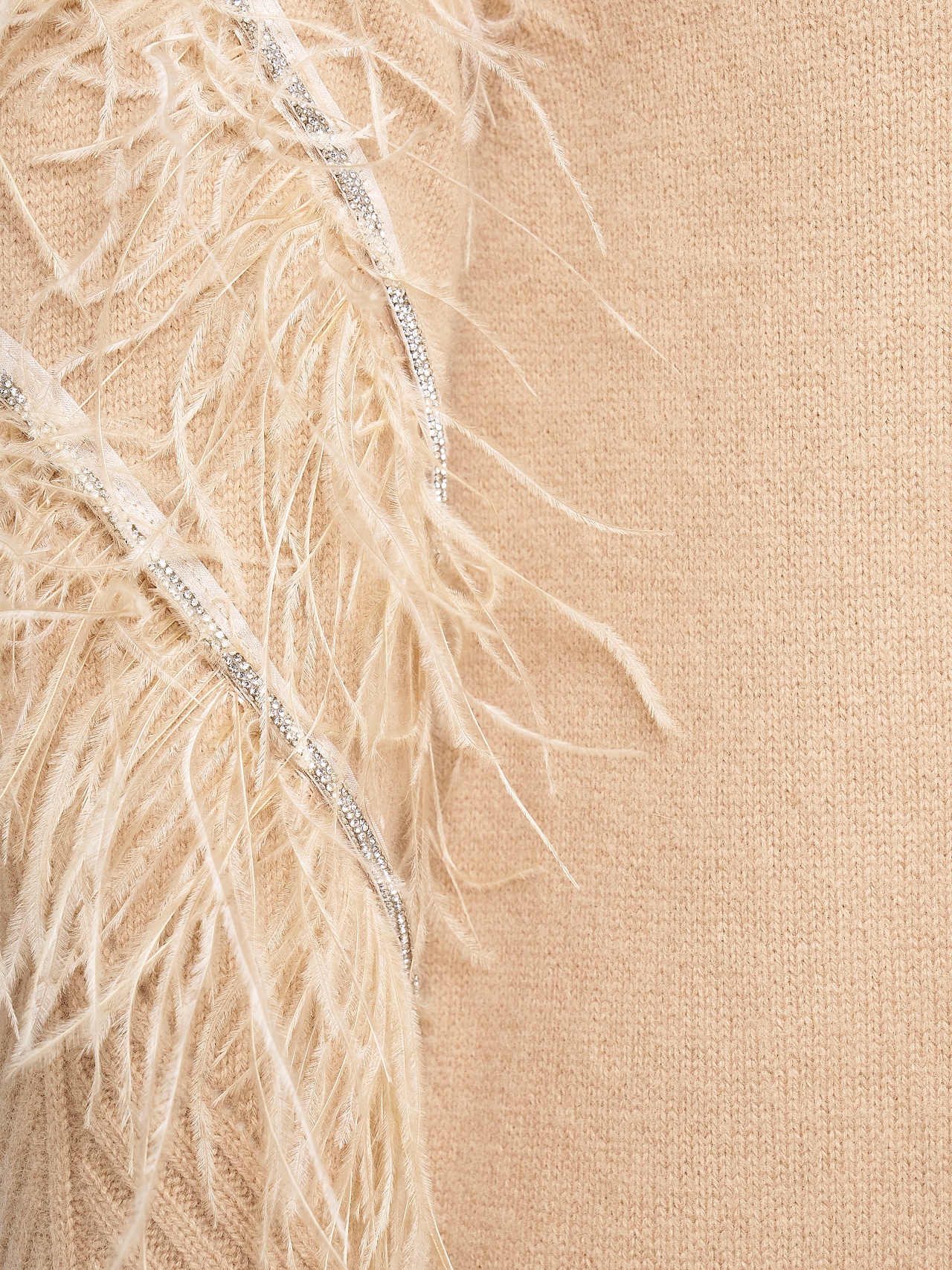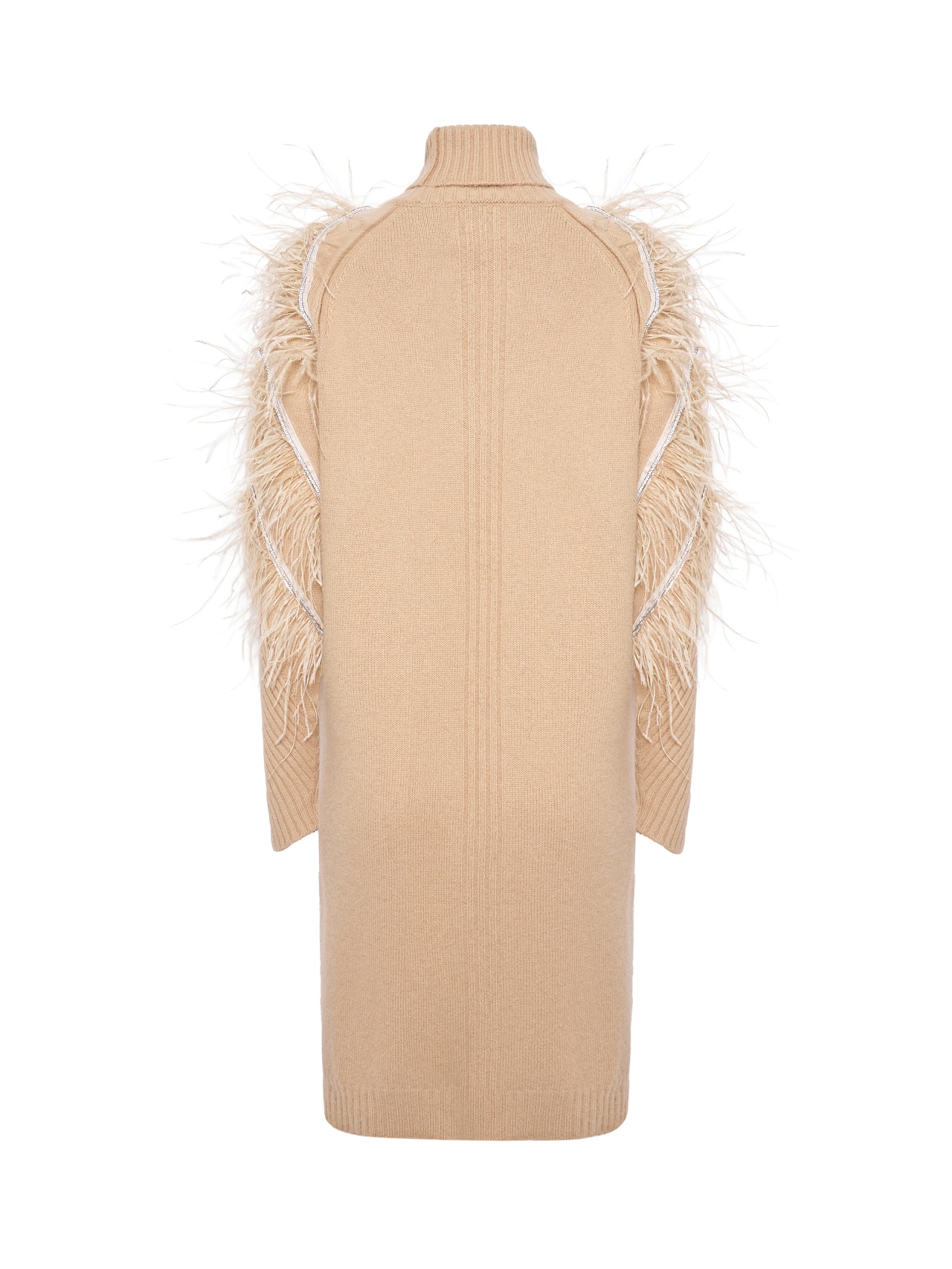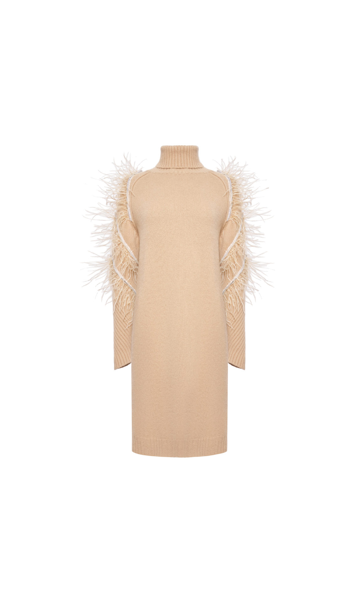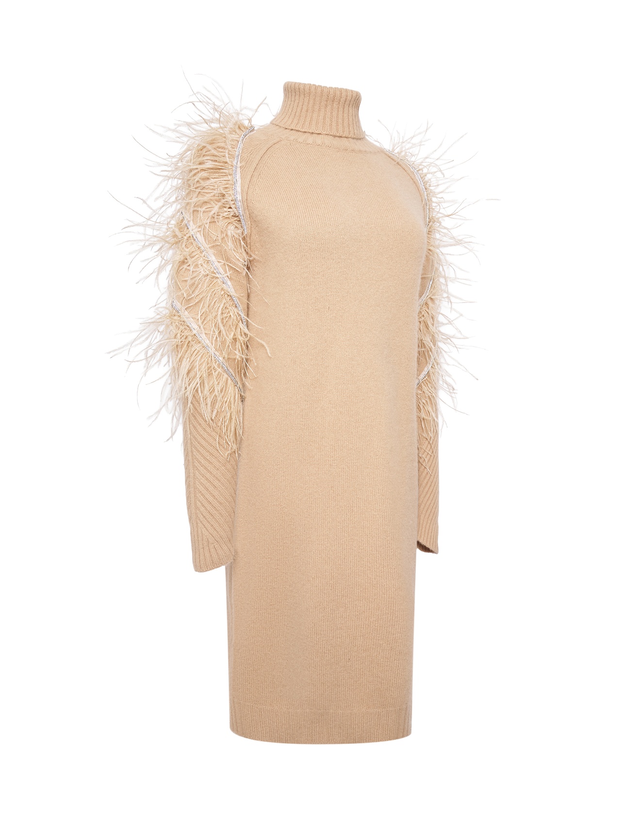 Приталенный крой и длина до колена подчёркивают женственность линий, а архитектурный дизайн рукава придаёт образу выразительность и свободу движения. Высокий воротник по типу водолазки акцентирует линию плеч и завершает образ благородной графичностью. Платье представлено в белом и бежевом оттенках. - Артикул: RKOK7657200Y_2)