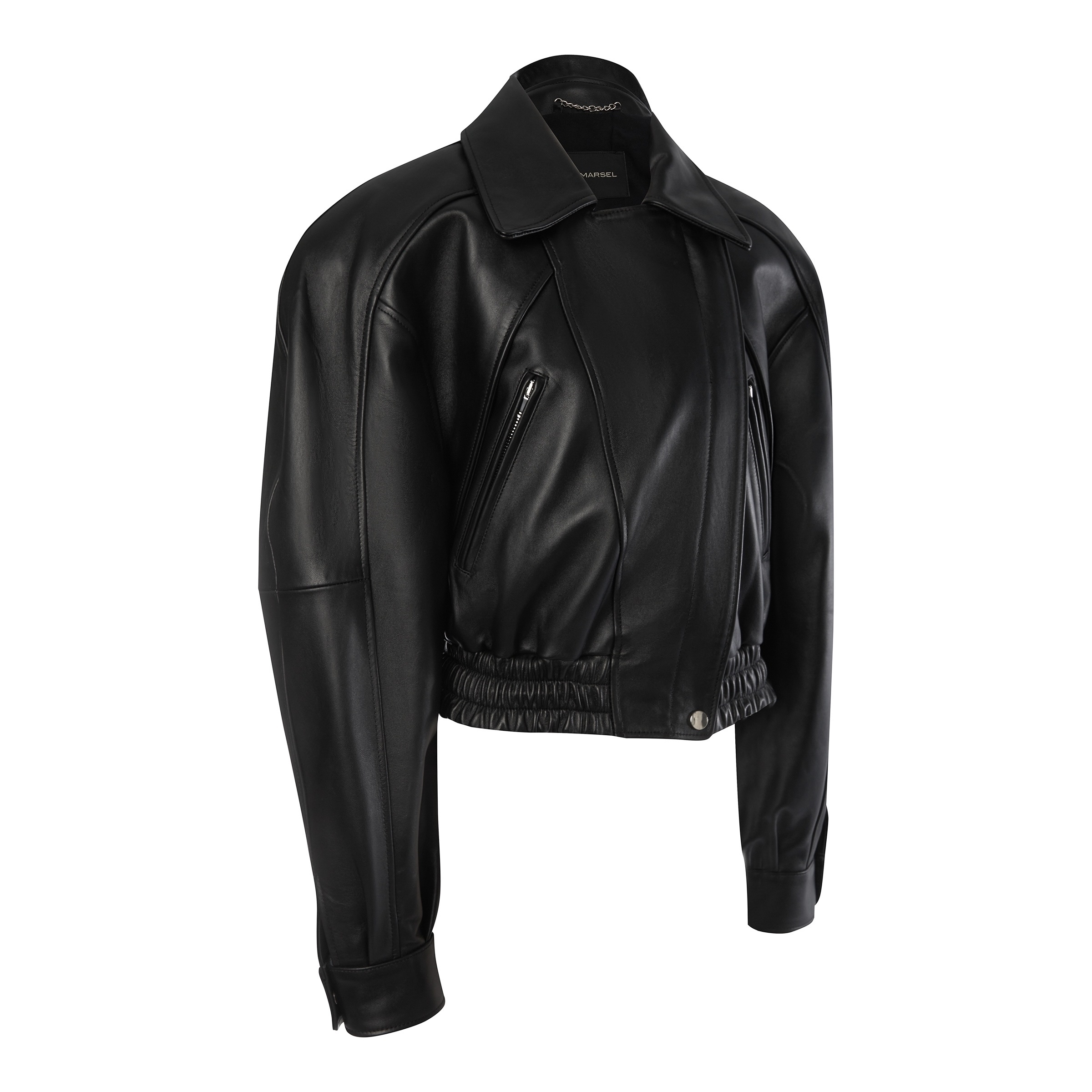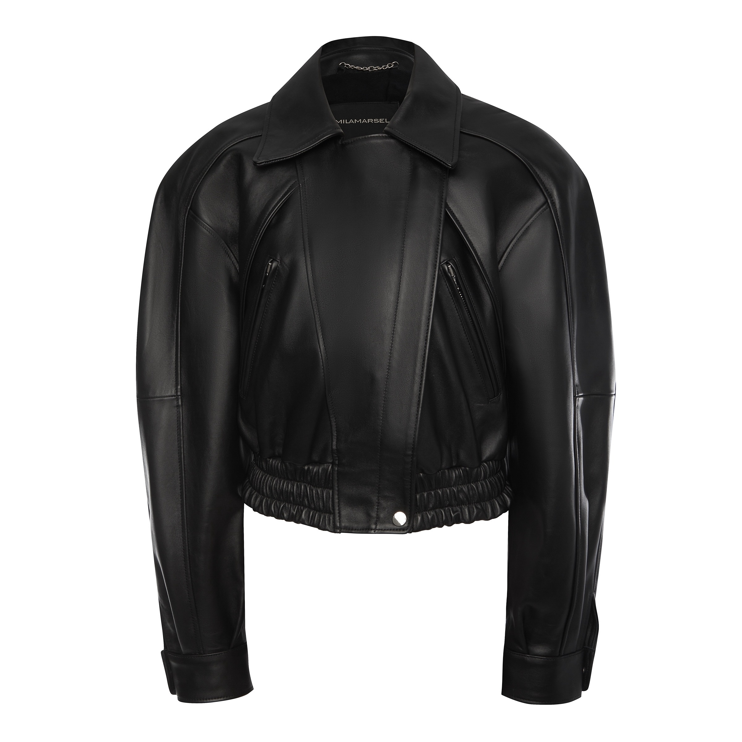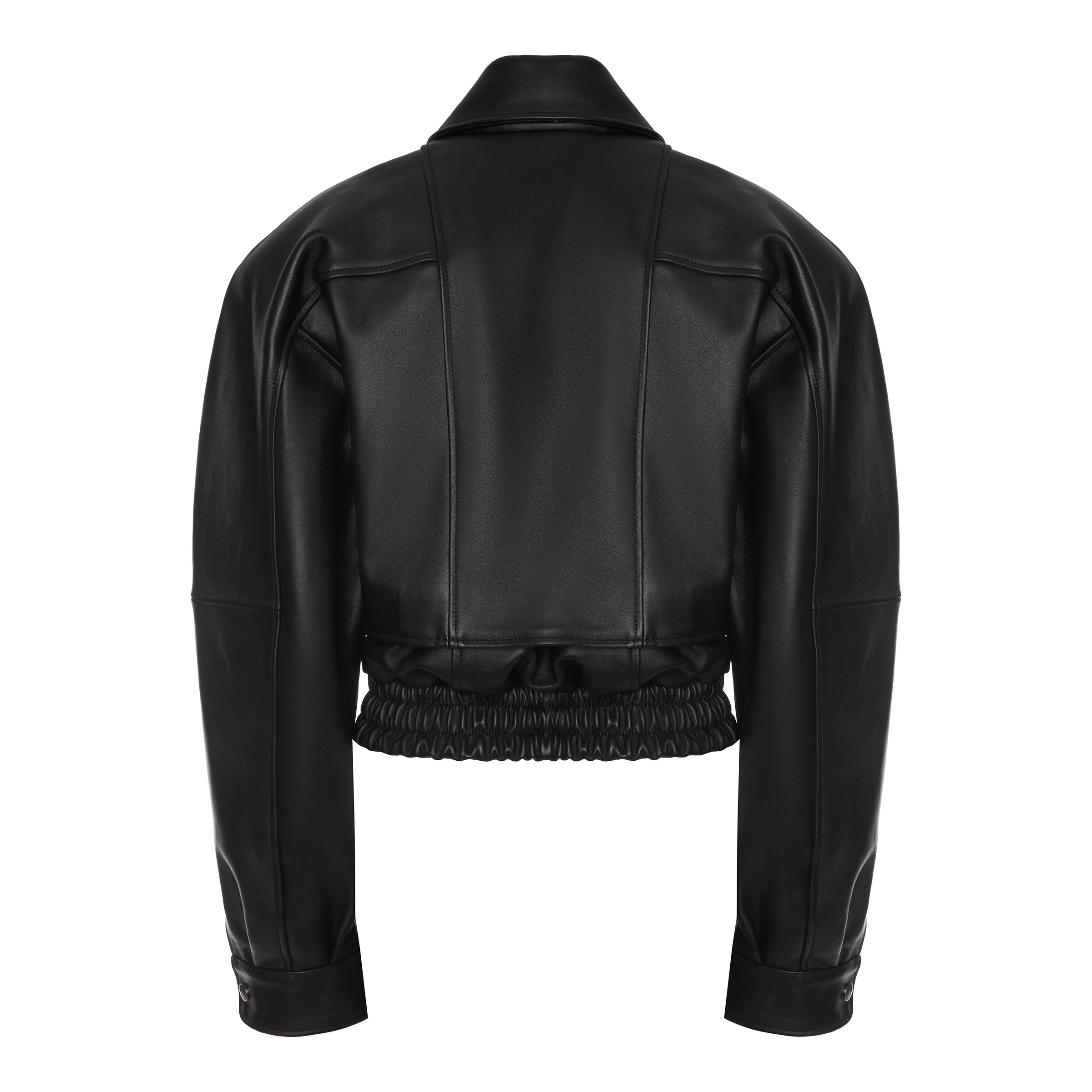 Современный укороченный жакет из мягкой кожи с классическим воротником и акцентом на линии плеч. Эластичная вставка понизу создаёт идеальную посадку, а лаконичный чёрный цвет делает модель универсальной и стильной. Идеально сочетается с джинсами "Море".