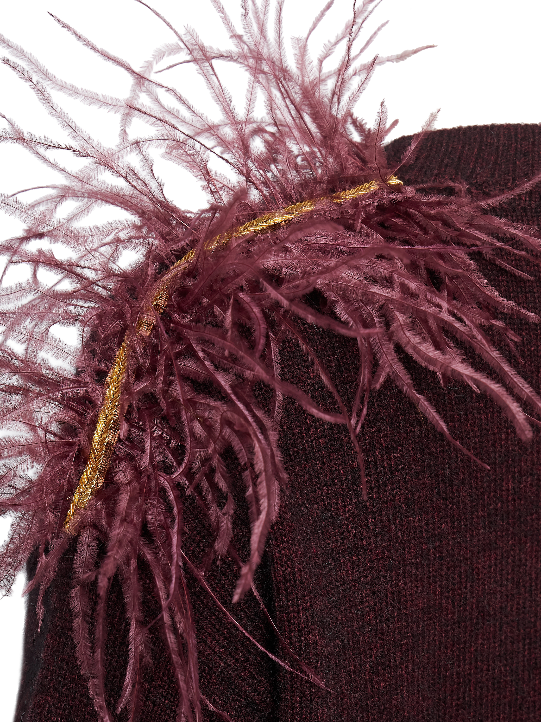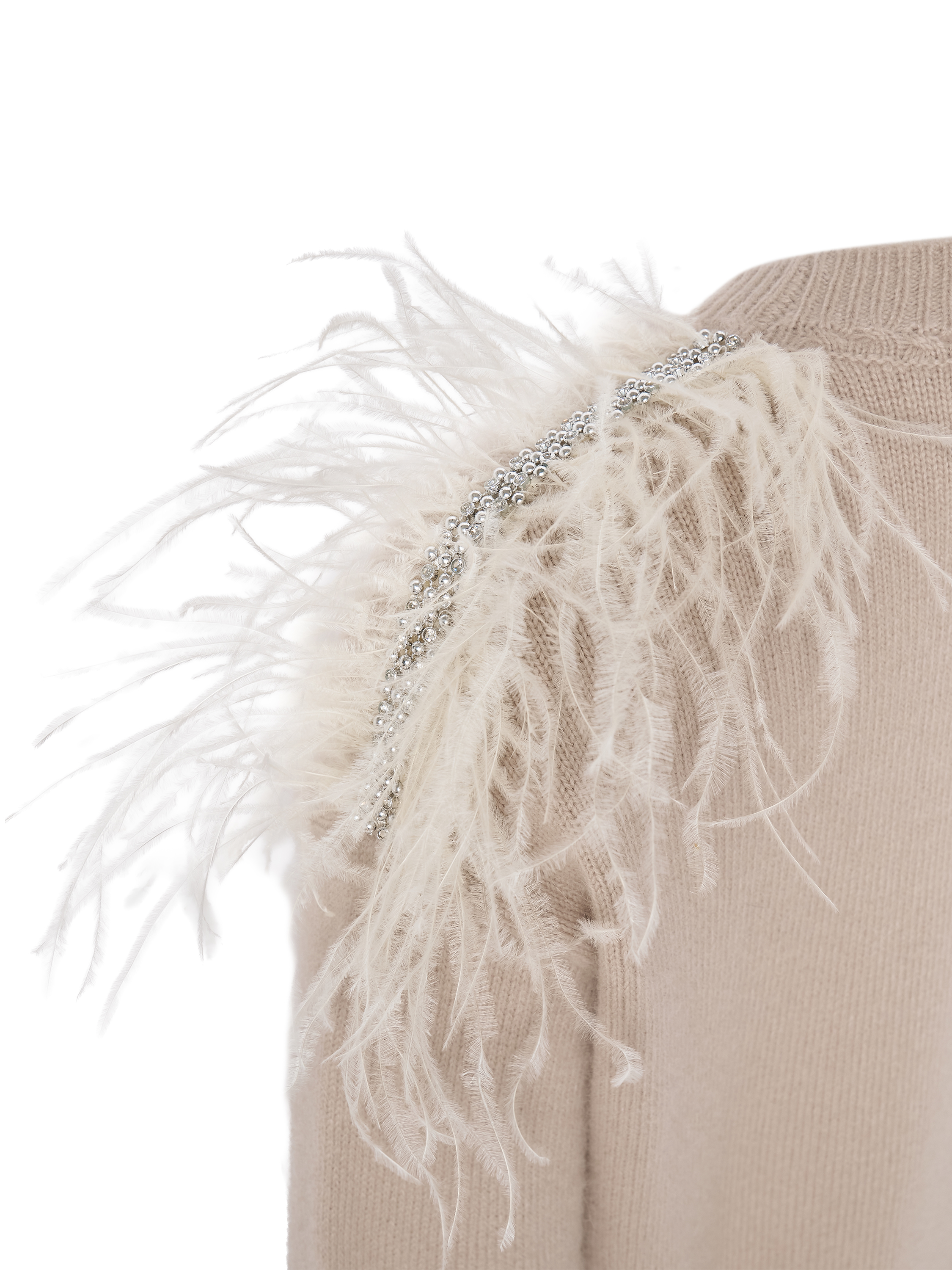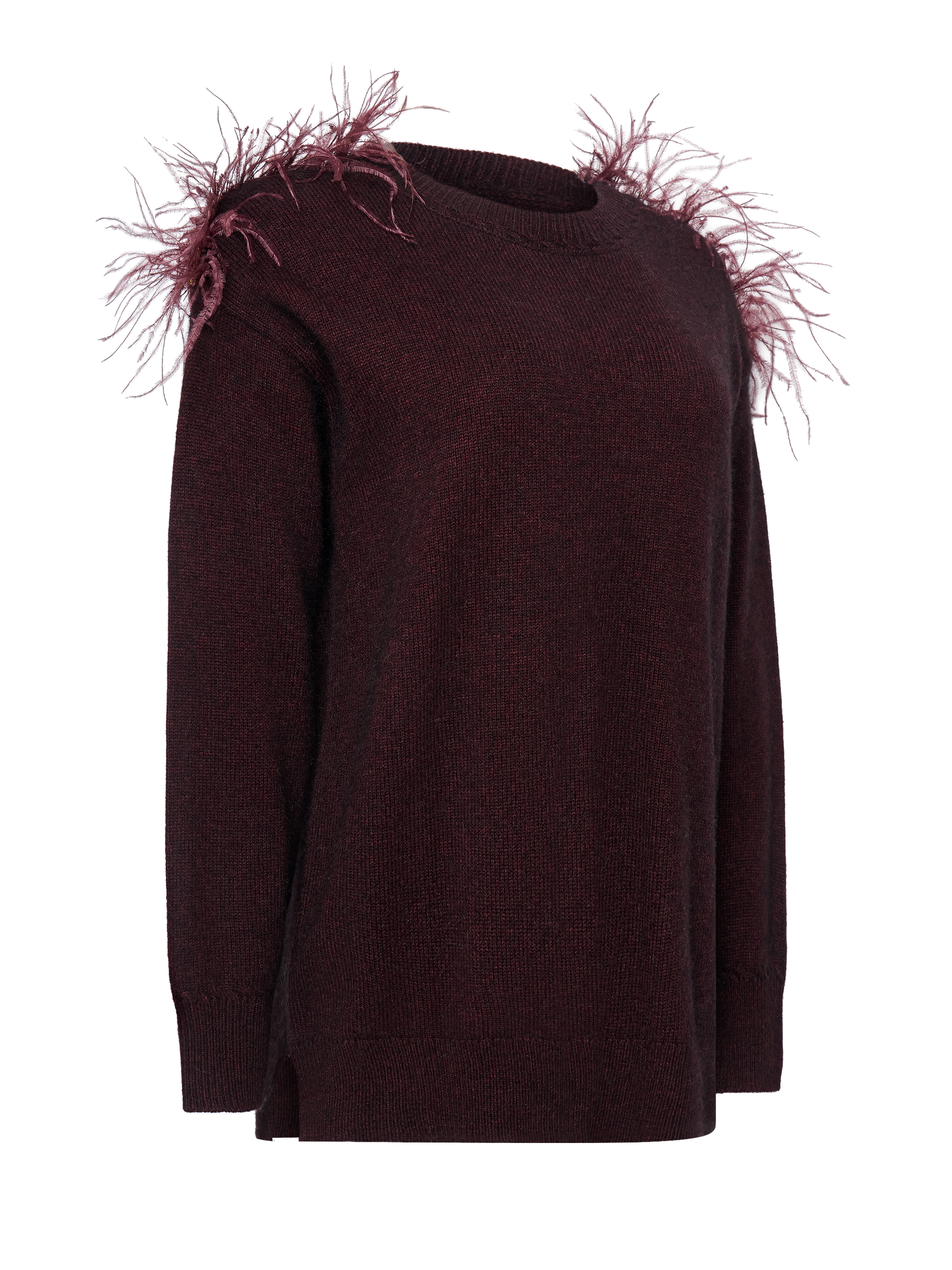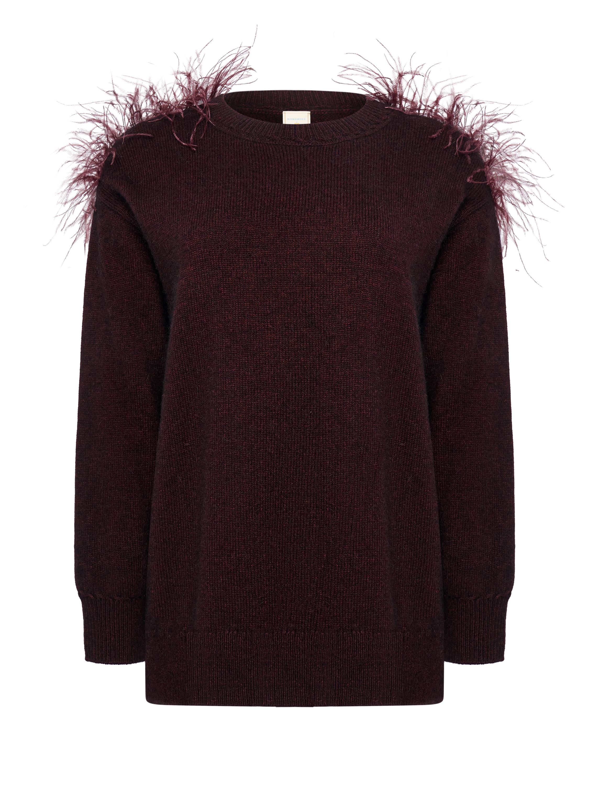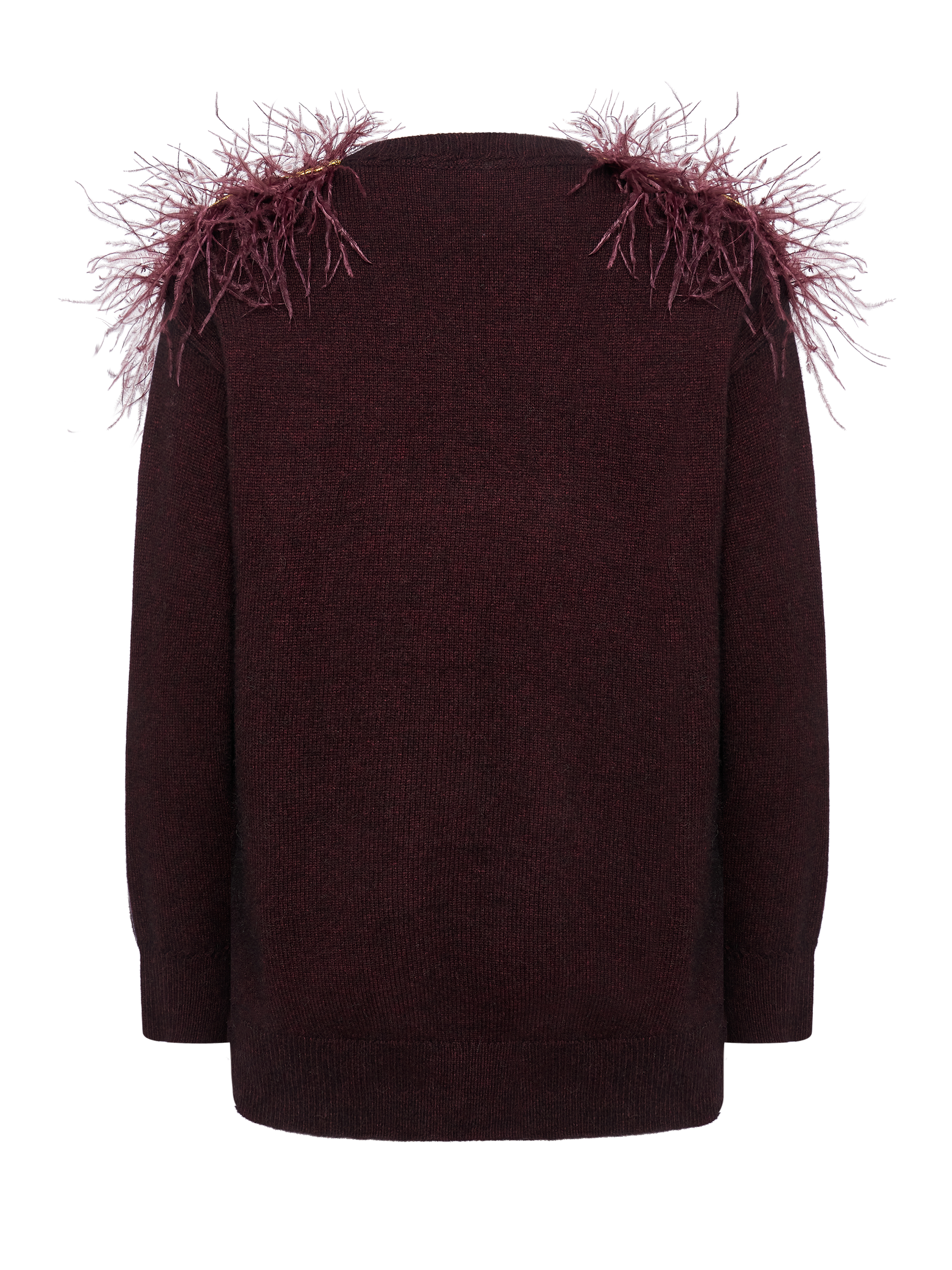 Лаконичный силуэт дополнен деликатным декором из перьев на линии плеч, создающим выразительный акцент и подчёркивающим эксклюзивный характер изделия. Джемпер представлен в сливовом и бежевом оттенках и органично вписывается как в повседневные, так и в вечерние образы. - Артикул: МKOK61125200Y_1